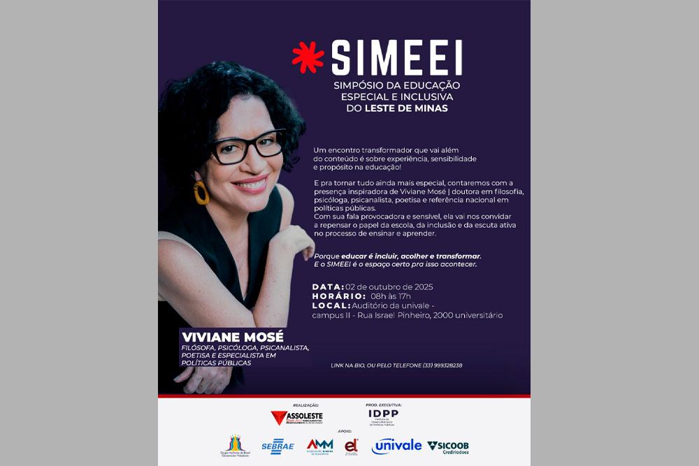 GOVERNADOR VALADARES – Governador Valadares será palco, nesta quinta-feira, 2 de outubro de 2025, do 2º Simpósio da Educação Especial e Inclusiva do Leste de Minas, que reunirá profissionais da educação e técnicos de toda a região. O evento, que acontecerá no auditório do campus II da Univale, das 8h às 17h, terá como ponto alto a palestra magna da filósofa e psicóloga Viviane Mosé, que vai discutir os desafios da escola contemporânea e a urgência de uma educação inclusiva.