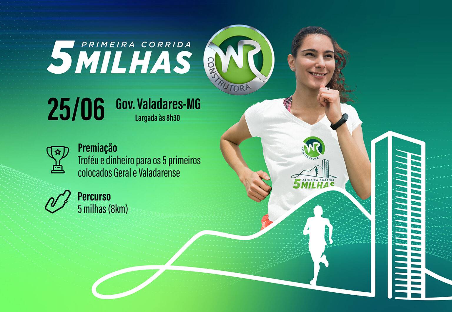 Estão abertas as inscrições para a 1ª Corrida 5 Milhas WR, organizada pela WR Construtora. O evento vai acontecer no dia 25 de junho (domingo), às 8h30, em Valadares. Segundo a assessora de comunicação da empresa, Leida Hermsdorff, a expectativa é que cerca de 500 pessoas participem da prova de 8km.